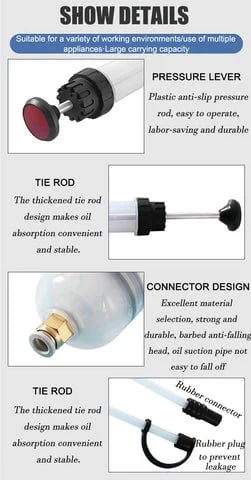 I absolutely love this tool! It made changing the oil in my car so much easier. The dual-purpose design allows me to both suction out the old oil and inject the new one with ease. The manual operation gives me total control over the process, and the syringe-type mechanism is smooth and efficient. I no longer need to deal with messy oil spills or awkwardly pouring from a jug. Highly recommend for anyone who does their own oil changes!
